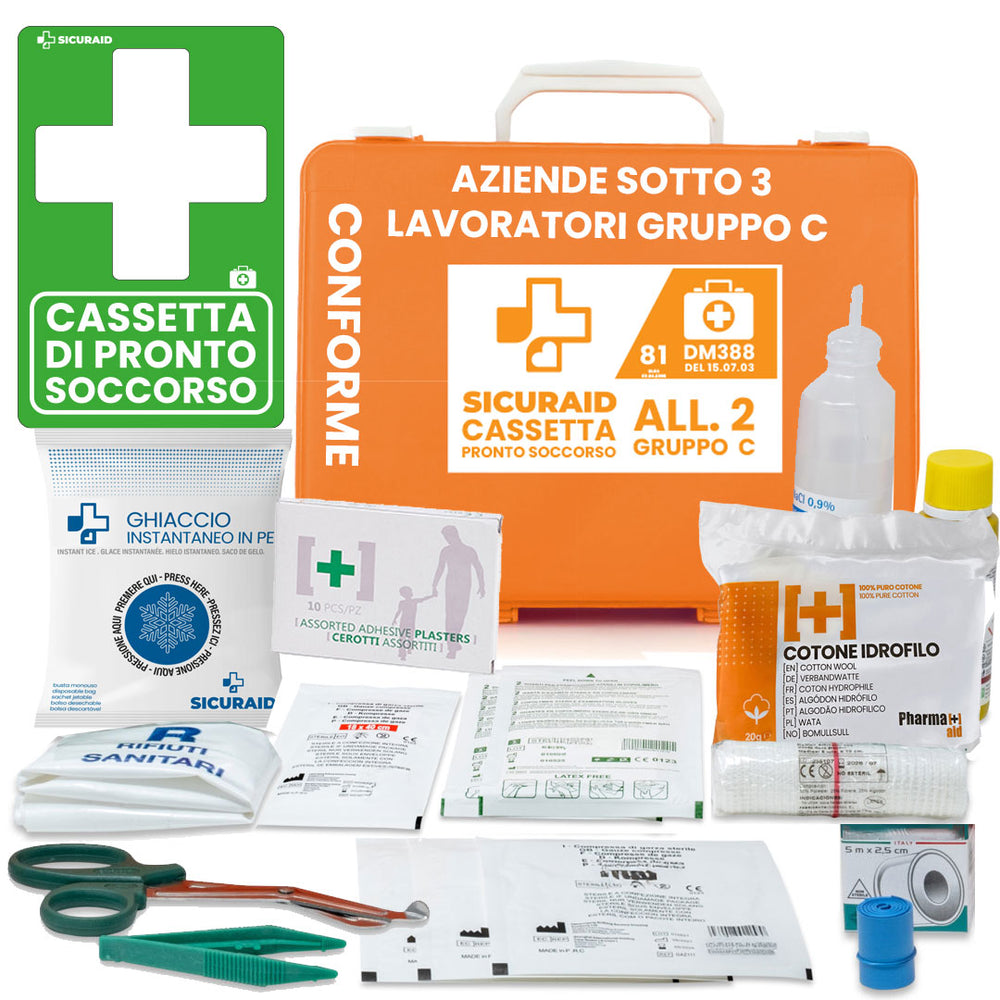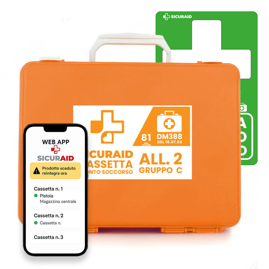La Cassetta di Pronto Soccorso SicurAID è il kit essenziale per aziende con fino a 2 dipendenti, studi professionali, negozi e attività a basso rischio.