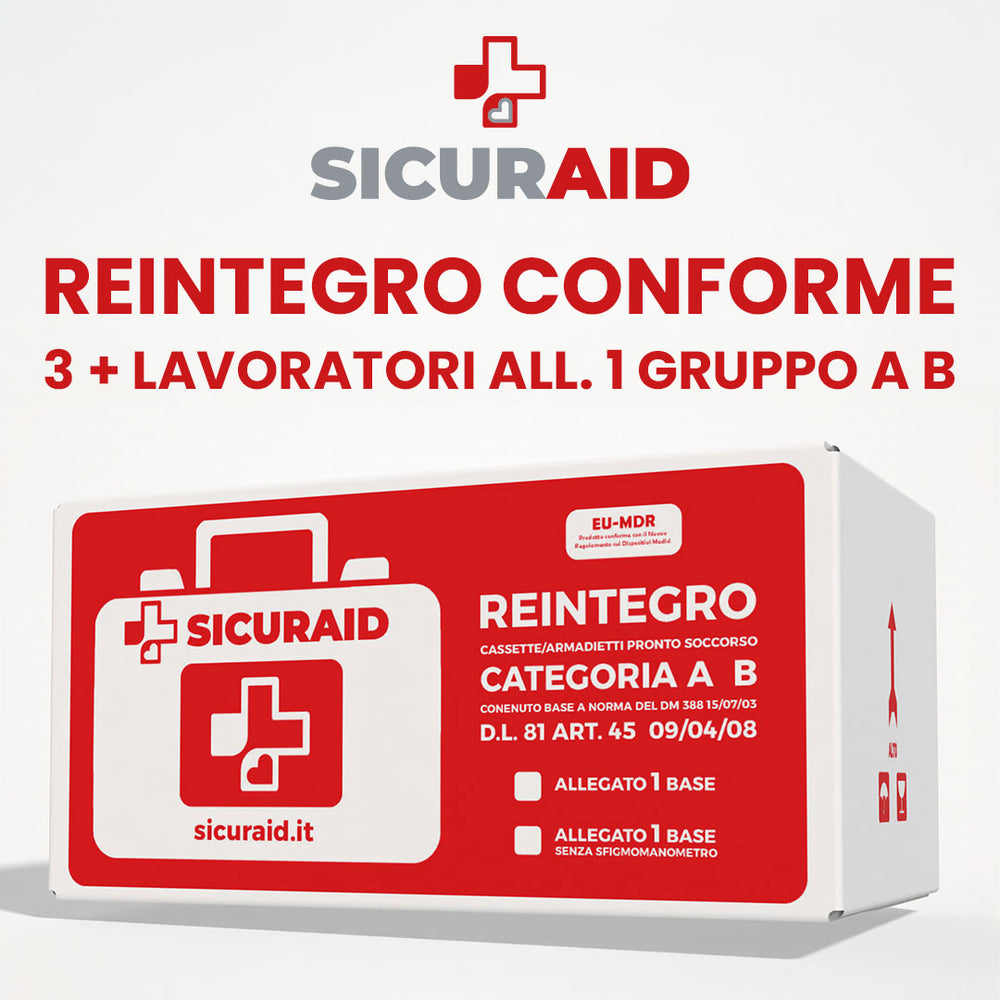 Kit di Reintegro Pronto Soccorso Allegato 1 – Sicurezza e Conformità per Aziende con 3 o più Dipendenti Il kit reintegro pronto soccorso aziendale Sicuraid è progettato per aziende con almeno 3 dipendenti, garantendo un kit primo soccorso azienda sempre conforme alle normative vigenti DM 388/2003 Allegato 1 e D.Lgs. 81/2008.